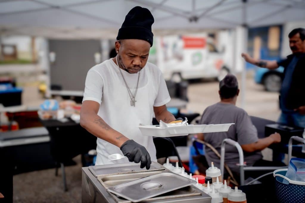 I asked her how she got here, to the corner with a tent and a smile. She replied ”I was a chef, still am a chef, at the Civic Center. When COVID happened, I got bored.” That boredom sparked an idea to invest in herself. She took a leap of faith, “ I bought two fryers, started out with wings, fish and fries. That wasn’t enough. I had to add sides.” Not only has her clientele grown but her menu has too. “I went from soul food to Jamaican food to Italian food, a little bit of everything, and I just haven’t stopped.”