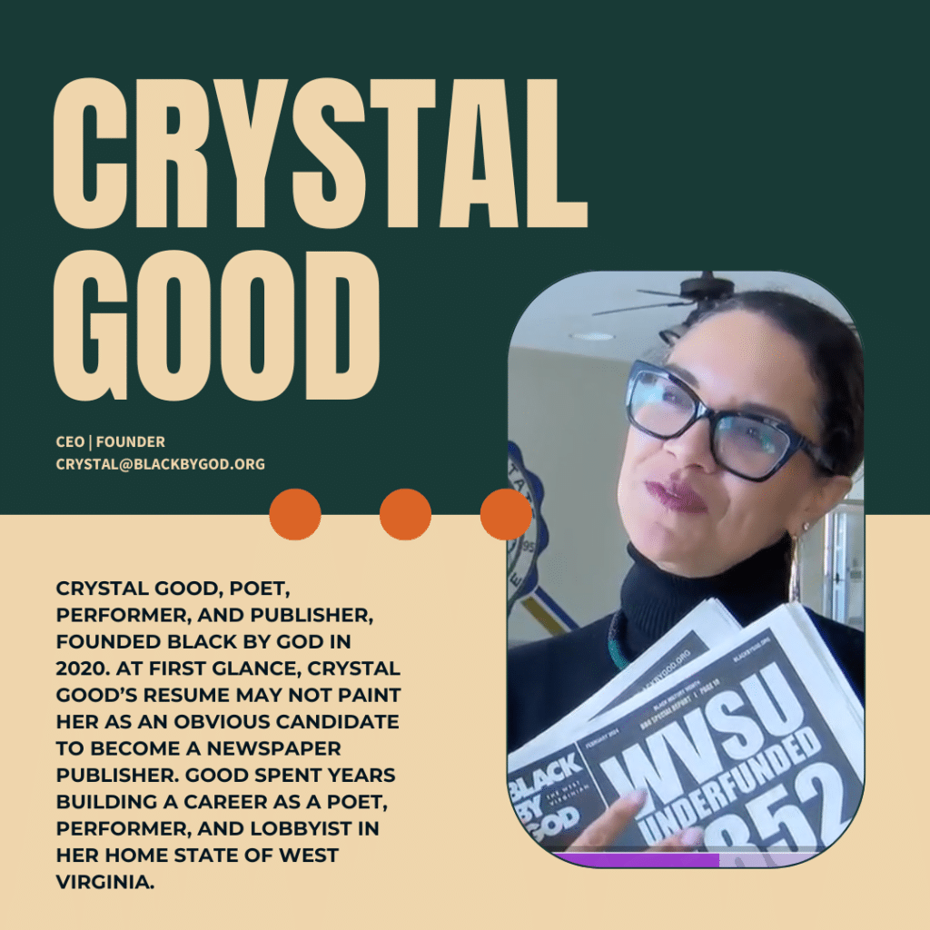 BBG is on a mission to revolutionize West Virginia’s media scene. We aim to lift the voices, perspectives, and issues of those overlooked by mainstream media, thereby strengthening the Black/BIPOC community’s impact. Our vision is to be recognized as a hub of excellence where new and established talent can thrive, promoting outstanding storytelling, design, and innovation. At BBG, we believe in the power of representation — not just as a core value but as a means to empower our community for better informed personal and political decisions, contributing to our people’s overall health and well-being. BBG was founded in 2020 by poet, performer, and publisher Crystal Good.